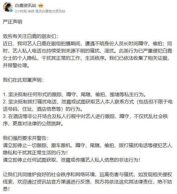 白鹿工作室当日发布严正声明,强烈谴责非法跟车、跟踪、偷拍等行为,明确表示已固定证据并保留法律追责权利,要求相关人员删除销毁非法影像,呼吁公众理性追星。这份声明展现了对侵权行为零容忍的态度。
