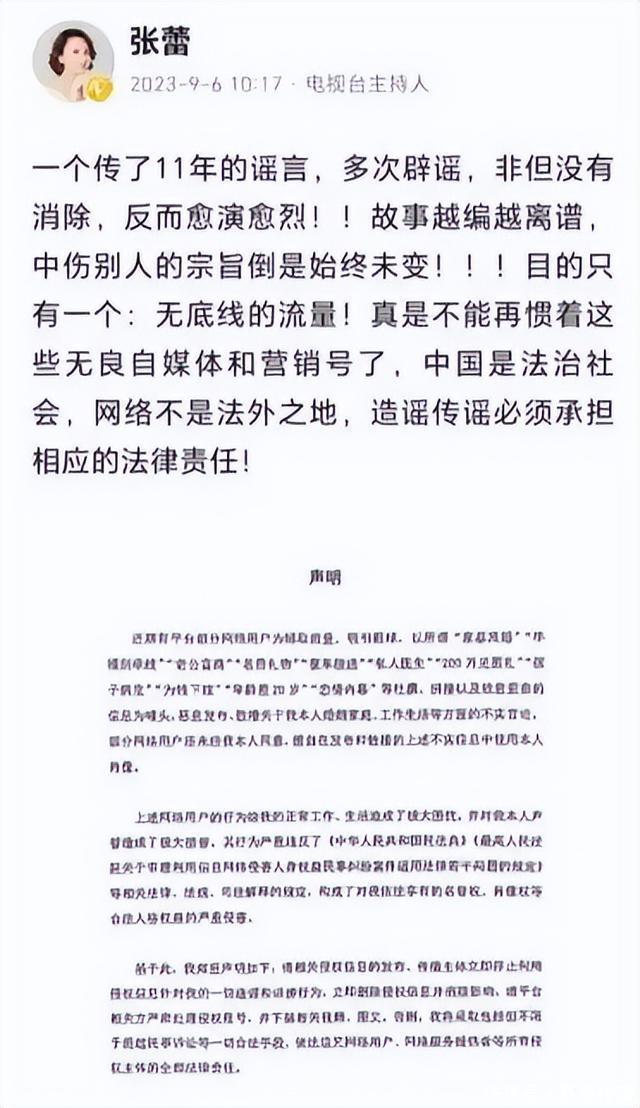 正所谓“造谣一张嘴,辟谣跑断腿”,也是体现在央视主持人张蕾身上了。 明明她踏实又努力,却被各种私生活谣言逼到澄清。 哪怕从央视离职了,依旧还有人盯着她的一举一动讨论。 那么,张蕾的私生活谣言有多离谱呢? 张蕾出生于文艺世家,从小在浓厚的艺术氛围中长大,父母注重对她的全方位培养,自幼学习舞蹈、声乐等才艺,文化课成绩始终名列前茅。她长相大气端庄,五官精致且极具辨识度,并非流水线式的网红脸,身形高挑挺拔,天生具备上镜优势。 怀揣着主持梦想,张蕾凭借优异的文化课与专业成绩,考入中国传媒大学播音与主持专业,这所院校是国内传媒领域的顶尖学府,也是众多央视主持人的成长摇篮。 在校期间,张蕾没有荒废学业,一边深耕专业知识,一边积极参与各类主持实践活动,积累了丰富的舞台经验,还未毕业就已主持过多场校园活动与地方节目,展现出超强的主持天赋。 2006年,她参加央视《挑战主持人》大赛,在万名参赛选手中凭借沉稳的台风、扎实的功底脱颖而出,一举拿下冠军,顺利获得央视入职资格,开启了长达十余年的央视主持生涯。 进入央视后,张蕾的事业稳步攀升,先后主持《欢乐中国行》《综艺盛典》等王牌综艺,多次搭档董卿、朱军等资深主持人,参与央视跨年晚会、春晚分会场等大型直播活动。 她主持风格亲和大气、控场能力出众,凭借专业实力收获了大批观众喜爱,逐渐成为央视综艺频道的核心主持力量之一。 2023年4月,张蕾官宣主动离开央视,并非网传的被动开除,随后她通过公开招聘入职北京电影学院,担任视听传媒学院副教授、硕士研究生导师,同时运营个人社交账号分享生活与文化内容,实现了平稳的职业转型。 张蕾的谣言最早始于2013年,这一年她低调结婚,因不愿过度曝光私生活,被别有用心的营销号抓住漏洞恶意揣测。 最初只是零星传言称其丈夫从事矿产生意,后续逐渐被歪曲放大,演变成“嫁给70岁矿产大亨”的离谱说法,造谣者还编造出豪车陪嫁、海外别墅、72桌奢华婚宴等虚假细节,将普通婚姻包装成“拜金嫁豪门”的戏码,刻意制造话题博取流量。 2016年前后,更不堪的“包养四个男人”谣言开始全网传播。该谣言的源头,仅是张蕾参加公益活动、工作场合与四位男士的正常合影,照片中双方保持合理社交距离,无任何亲密举动,却被营销号恶意裁剪、拼接、PS,杜撰出“包养对象”的虚假身份。 甚至编造每月花费几十万供养、赠送房产等细节,误导大量不明真相的网友跟风转发,给张蕾贴上“私生活混乱”的标签。 2025年,张蕾参与公益活动主持,身着蓝色西装套装搭配紧身裤,着装得体大方、符合场合要求,却被恶意截图解读。部分网友无视活动性质与着装规范,指责其“博眼球、搞擦边”,甚至发布低俗评论、恶意开黄腔。 张蕾直接在社交平台回应“人心脏,看什么都是脏的”,晒出活动全程视频自证清白,却依旧未能阻止谣言扩散。除此之外,“家暴离婚”“孩子病危”“被央视开除”等谣言也反复翻炒,形成“辟谣赶不上造谣”的恶性循环,即便张蕾多次澄清,依旧有人信以为真。 面对初期谣言,张蕾秉持“清者自清”的态度选择沉默,希望谣言能不攻自破,可她的退让反而让造谣者更加肆无忌惮。 2017年,她受邀参加《春妮的周末时光》访谈节目,首次公开正面辟谣,坦言丈夫是普通生意人,与自己年龄相仿,婚姻低调和睦,为了让公众信服,她还当场拨通丈夫电话,年轻的声音直接击碎“70岁富翁”的谎言。 2023年9月,针对持续十余年的恶意谣言,张蕾发布正式严正声明,逐条否认“包养男人”“嫁富豪”“被开除”等所有不实传闻,强调网络并非法外之地,要求造谣账号立即删除侵权内容,否则将依法追究全部法律责任。 随后她正式起诉12个长期散布谣言的账号,经法院审理查明,相关账号为博取流量恶意编造、拼接虚假信息,已构成名誉侵权,最终被判公开道歉并赔偿经济损失,部分恶意营销号被平台永久封禁,庭审中也证实,所有谣言“证据”均为伪造,无任何事实依据。 针对“被央视开除”的核心谣言,央视官网与张蕾本人先后回应,证实其为主动离职,17年央视生涯无任何违纪记录,离职是个人职业规划的选择,并非受私生活影响。各类谣言均为营销号为流量恶意杜撰,司法判决与官方回应彻底击碎了谣言的虚假外壳,也还张蕾一个清白。 张蕾的遭遇并非个例,在女性公众人物中尤为普遍。李思思、朱迅、董卿等央视女主持人,均曾被编造“嫁富豪”“私生活混乱”等恶意谣言,这类谣言往往聚焦女性隐私,刻意无视其专业能力与职业成就,传播速度远快于正能量内容,核心源于营销号的流量焦虑与部分网友的猎奇心理,更形成了“造谣-传播-盈利”的灰色产业链。 对比男性公众人物的舆论环境,女性从业者更容易被私生活绑架,业务成绩被刻意忽视,无根据的八卦取代专业评价成为舆论焦点。 这种双重标准背后,是网络空间对女性的偏见与恶意,也是造谣成本极低、维权成本极高的行业痛点:造谣者动动手指就能炮制一条谣言,72小时阅读量就能破亿;而被造谣者往往需要耗费数月甚至数年时间维权,即便胜诉,也难以彻底消除谣言带来的负面影响。 从法律层面来看,造谣传谣均需承担民事甚至刑事责任,张蕾的维权行为,为公众人物应对网络谣言提供了范本,也警示造谣者需为自身行为付出代价。 遏制谣言传播,既